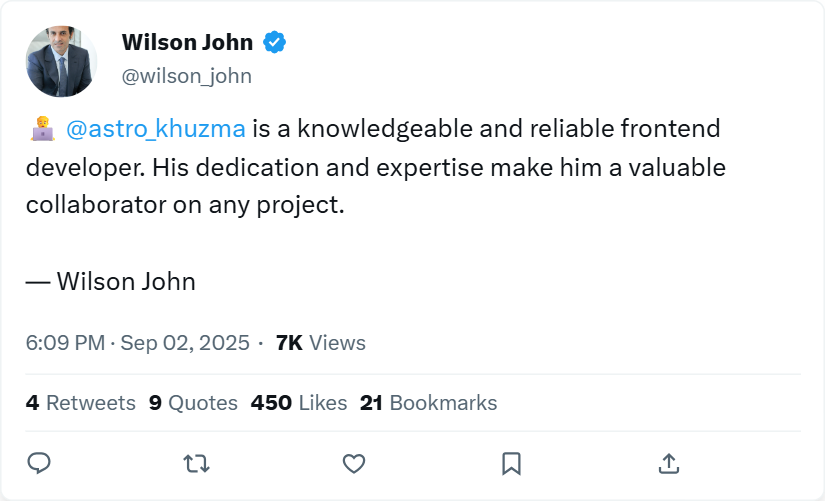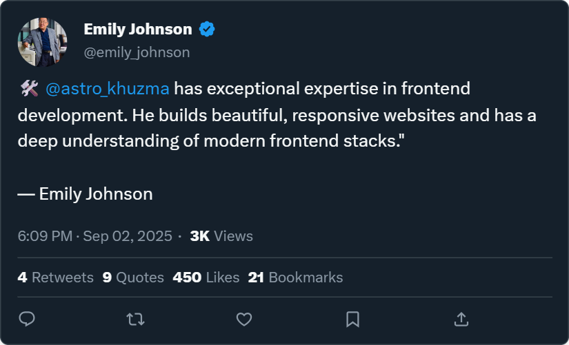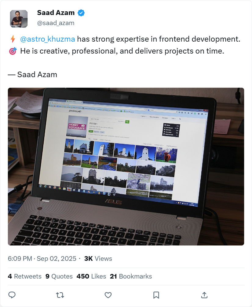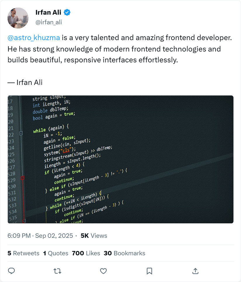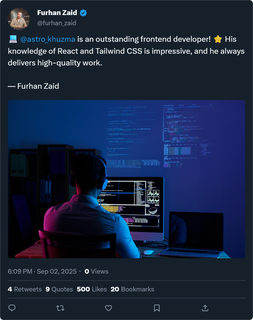 My name is Muhammad Khuzaim, but you can call me Astro Khuzma. I am from Lahore and currently in my second year of Software Engineering. I am a frontend developer with strong knowledge of modern frontend technologies like React and Tailwind CSS, and I have built several projects using these tools. I am also a graphic designer, working on branding and design using Photoshop and Illustrator. One of my favorite hobbies is astronomy—I love studying stars, planets, and the universe. That curiosity about space inspired my nickname, Astro Khuzma. I am also a member of IEEE and the SET Society, where I contribute to projects related to my field. My goal is to keep learning, improving my skills, and building useful projects that can solve problems and make a positive impact in the future.